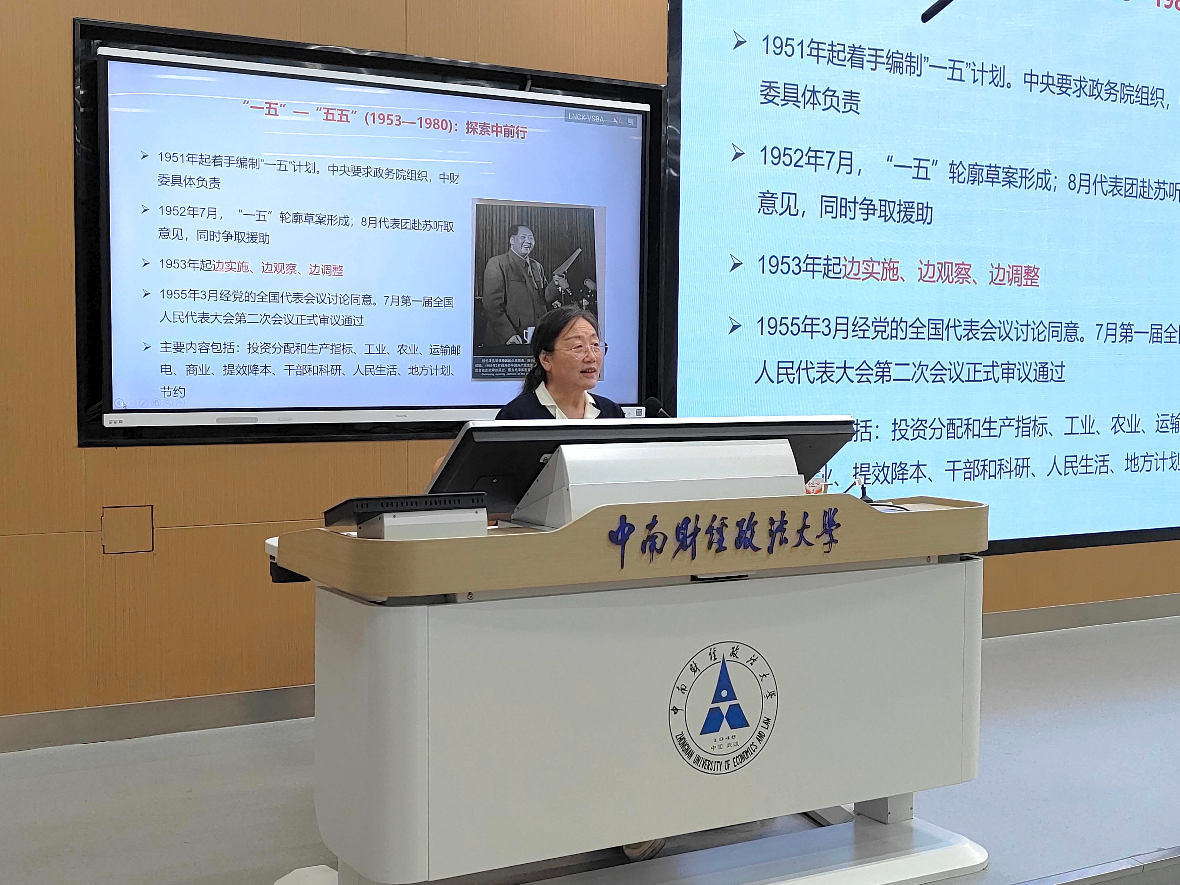 课程开始,周南以我国“一五”至“十三五”规划的历史变迁为切入点,系统阐述了五年规划内容的演进轨迹。她指出,早期五年规划主要聚焦经济建设领域,随着国家发展需求的拓展,如今已延伸至政治、文化、社会、生态、民生等多个维度;规划逻辑也从时间维度的线性规划,逐步拓展为时空结合的立体布局。在规划呈现方式上,她介绍,当前五年规划通过指标表量化发展目标、借助图表规划空间布局、以专栏形式阐述重点项目,使规划内容更加直观易懂。谈及五年规划的实施机制,她强调,坚持党的领导是规划有效落地的根本保证——党为规划制定指明战略方向、凝聚全社会力量;同时,通过持续创新工作机制与方法,充分调动政府、市场、社会等各方积极性,形成全民参与、协同推进的实施合力,确保规划蓝图转化为发展实效。