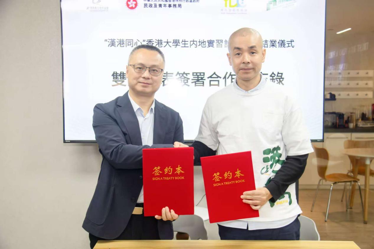 在与港隽动力青年协会交流中,代表团与港隽动力青年协会联席主席郑纪谦、谢伟忠等进行友好交流,并应邀参加“汉港同心”香港大学生内地实习计划2025结业仪式,陈狮副书记与会致辞并签署合作备忘录。