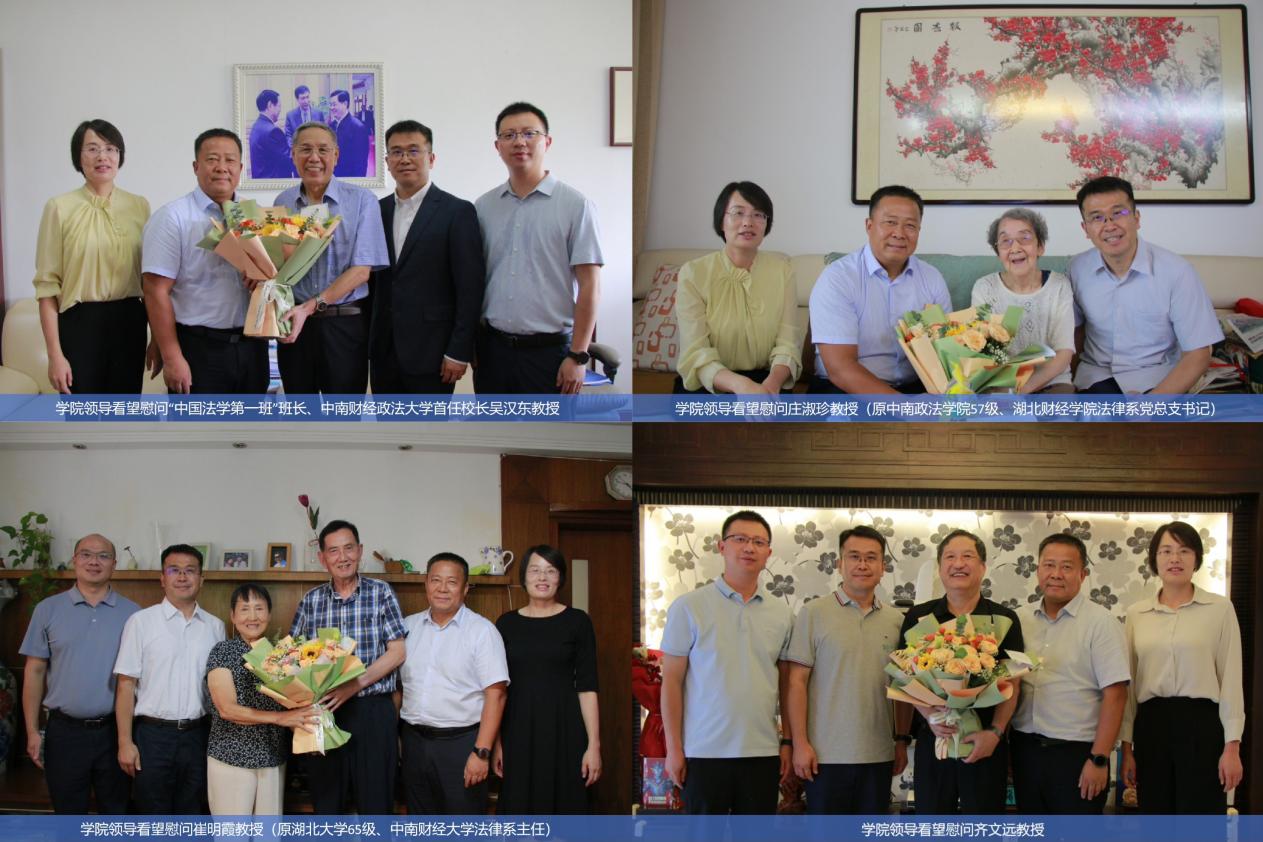 新闻网讯 9月5日至8日,在第41个教师节来临之际,法学院党委书记高碧峰,学术院长侯猛,党委副书记李司铎、陈金川一行,走访慰问了“中国法学第一班”班长、中南财经政法大学首任校长吴汉东教授,庄淑珍教授(原中南政法学院57级、湖北财经学院法律系党总支书记)、崔明霞教授(原湖北大学65级、中南财经大学法律系主任)、齐文远教授、方世荣教授、郑祝君教授、萧伯符教授、刘克俭老师(原中南政法学院年级主任)及夫人薛秋蝶老师(原中南政法学院班主任)等退休教师代表,及陈景良教授、刘茂林教授、姚莉教授、刘大洪教授等在职教师代表,并向他们致以节日的诚挚问候和崇高敬意。
