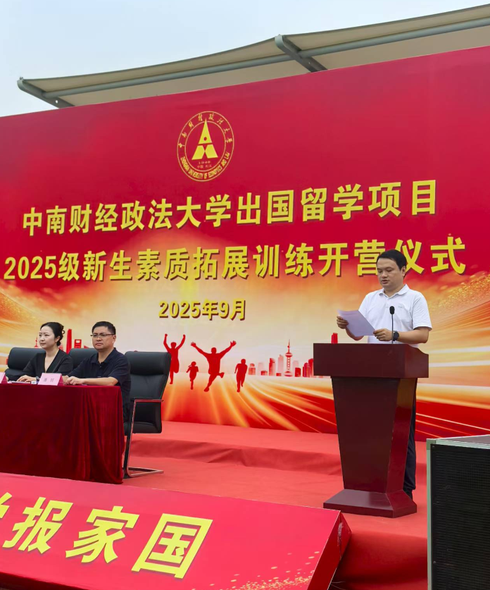 9月11日上午,新生开学典礼暨素质拓展训练营开训仪式在校外综合实践基地举行。副校长刘仁山、继续教育学院院长赵凯、国际教育学院副院长杨苗、全体教官、辅导员及2025级全体新生出席。开训仪式由杨苗主持。