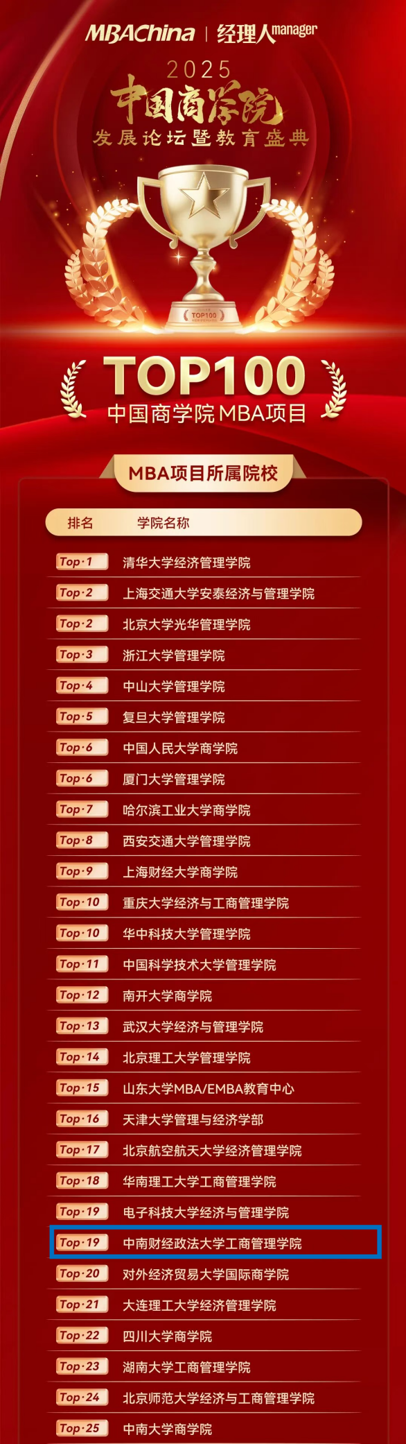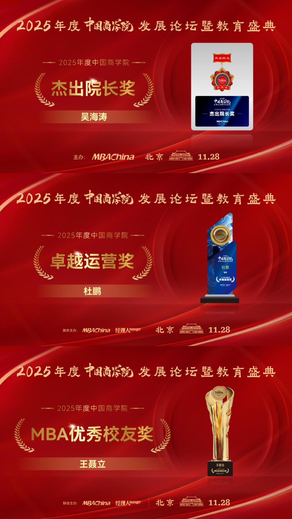 新闻网讯(通讯员 董红英 范梦宇)11月28日,由MBAChina和《经理人》杂志联合主办的“2025年度中国商学院发展论坛暨教育盛典”在北京成功举办。来自全国百余所院校的三百余位院校领导、专家学者及相关负责人齐聚一堂,共同探讨AI时代商科教育的革新路径。盛典现场,MBAChina和《经理人》杂志重磅发布2025年度中国商学院MBA项目TOP100榜单。在本次公布的榜单中,中南财经政法大学工商管理学院荣获“2025年度中国商学院MBA项目TOP100”第19名,工商管理学院MBA项目荣获“2025年度中国商学院金融MBA项目TOP10”第6名,院长吴海涛教授荣获2025年度中国商学院杰出院长奖,副院长杜鹏教授荣获2025年度中国商学院卓越运营奖,EMBA校友王聂立荣获2025年度中国商学院MBA优秀校友奖,再次获得多项殊荣,体现了社会各界对于我院人才培养、学科发展、品牌建设的多方面认可。