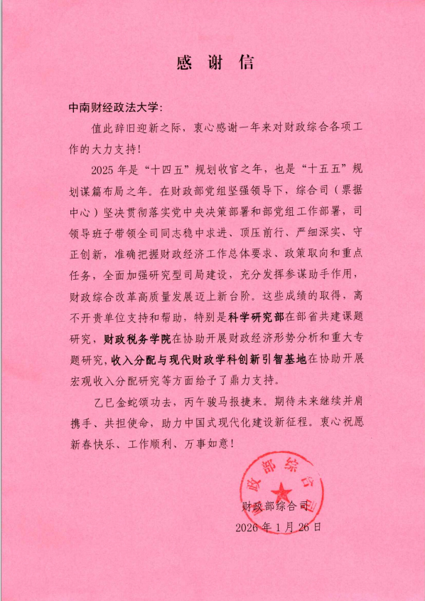 在这辞旧迎新的美好时刻,这份承载着肯定与期许的信函,不仅是对学校过去一年服务国家财政综合改革工作的高度认可,更是对全体中南大人深耕学术、服务国家战略初心的鼓舞。