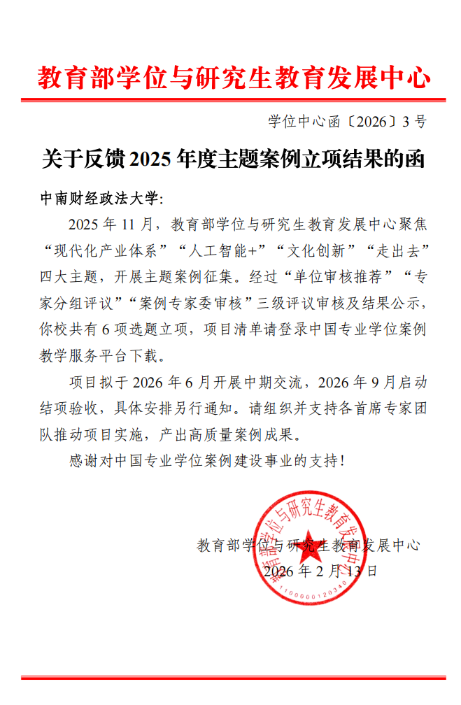 新闻网讯(通讯员 张景瑜)2月13日,教育部学位中心公布了2025年主题案例立项名单,我校申报的6项主题案例全部获批立项,覆盖“现代化产业体系”“人工智能+”“文化创新”“走出去”四大主题,立项率连续两年实现100%,主题覆盖率达100%,迎来案例建设“开门红”。