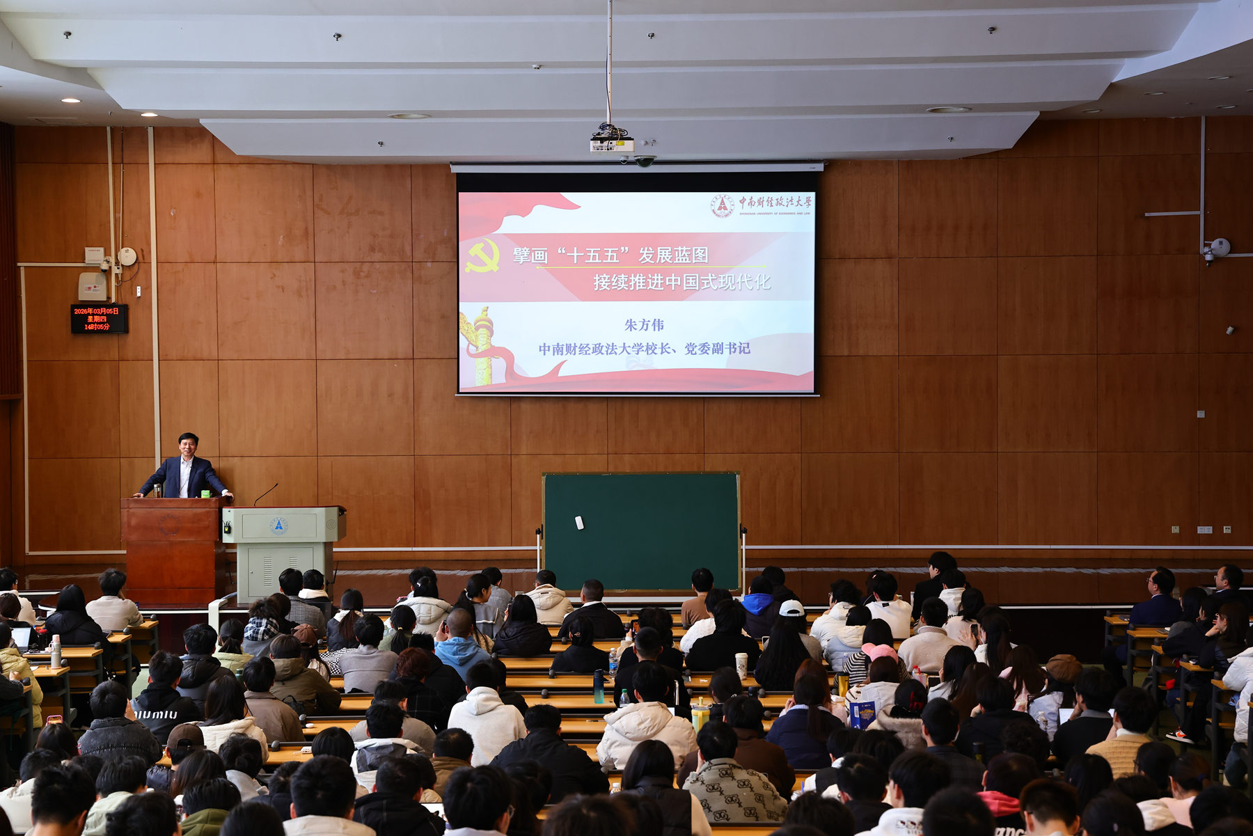 新闻网讯(记者 侯竟 摄影 杜鹏)3月5日下午,正值全国两会隆重召开、《中华人民共和国国民经济和社会发展第十五个五年规划纲要(草案)》提交审查的重要时刻,我校融通课程《国家蓝图与青年未来:“十五五”规划的时代解读》在文泰楼321教室正式开讲。校长、党委副书记朱方伟教授以《擘画“十五五”发展蓝图,接续推进中国式现代化》为题,带来一堂兼具理论深度与实践温度的开篇授课,系统解读“十五五”规划的核心内容与时代价值。