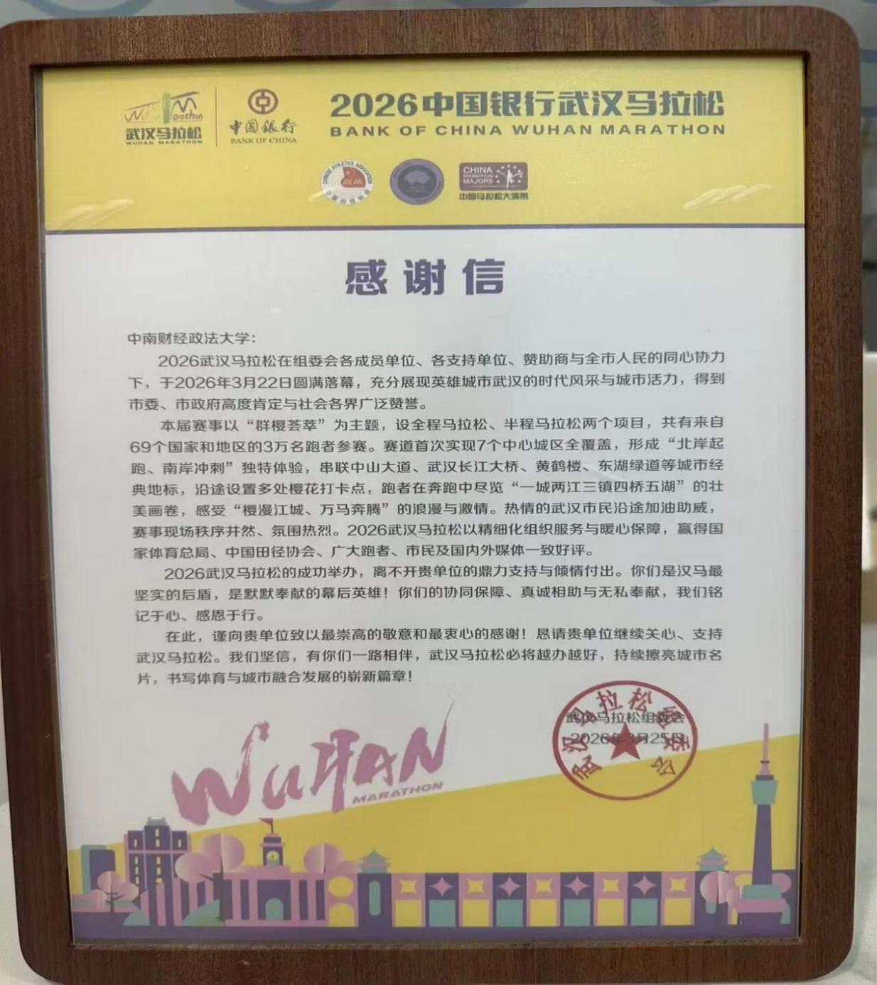 武汉马拉松给我校的感谢信