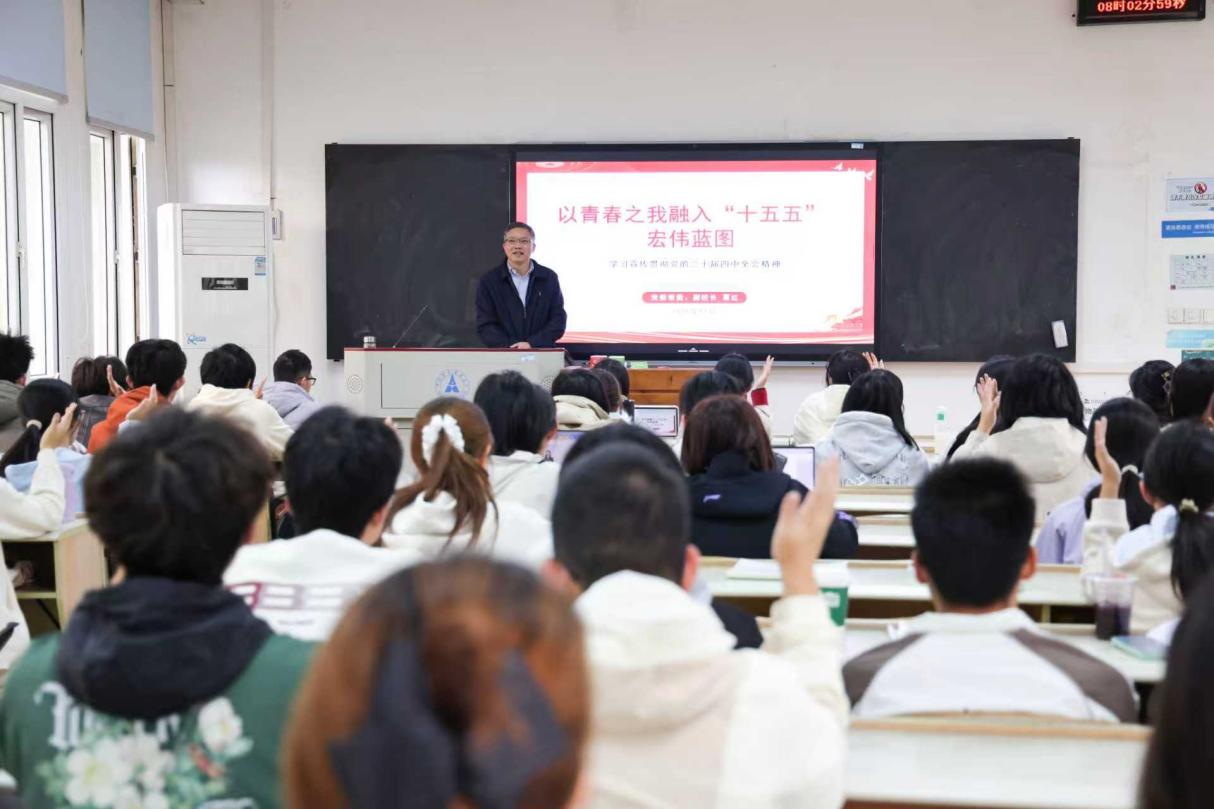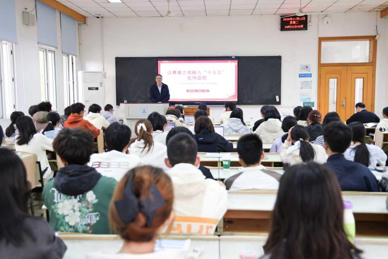 新闻网讯(通讯员 李成)11月11日上午,党委常委、副校长覃红在首义校区文泽楼305教室为会计学院本科生讲授《以青春之我融入“十五五”宏伟蓝图——学习宣传贯彻党的二十届四中全会精神》专题思政课,马克思主义学院部分青年教师参与现场观摩。
