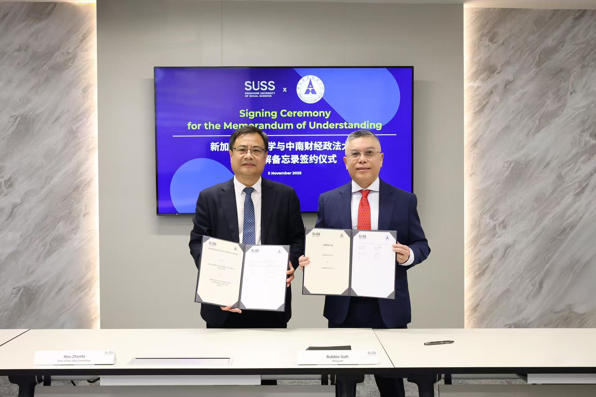 新闻网讯(通讯员 祖宝璐)11月3日至7日,中南财经政法大学党委书记侯振发应邀率团赴新加坡开展交流访问。代表团先后访问新加坡管理大学(SMU)、新加坡社科大学(SUSS)、新加坡国立大学(NUS)等知名高校,并走访新加坡特许会计师协会(ISCA)、时代财智杂志等业界机构,围绕校际合作、校企协同、海外实习基地建设等方面深入交换意见,达成多项合作共识。