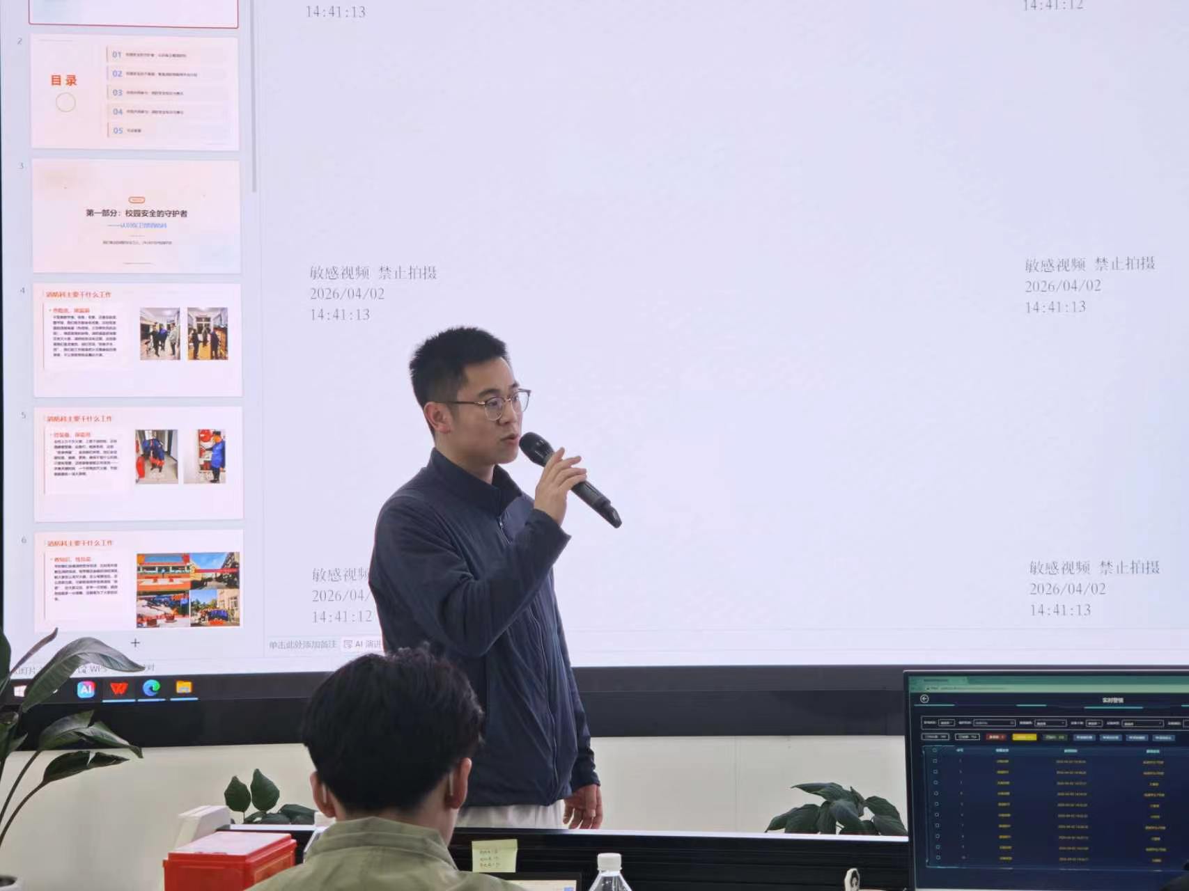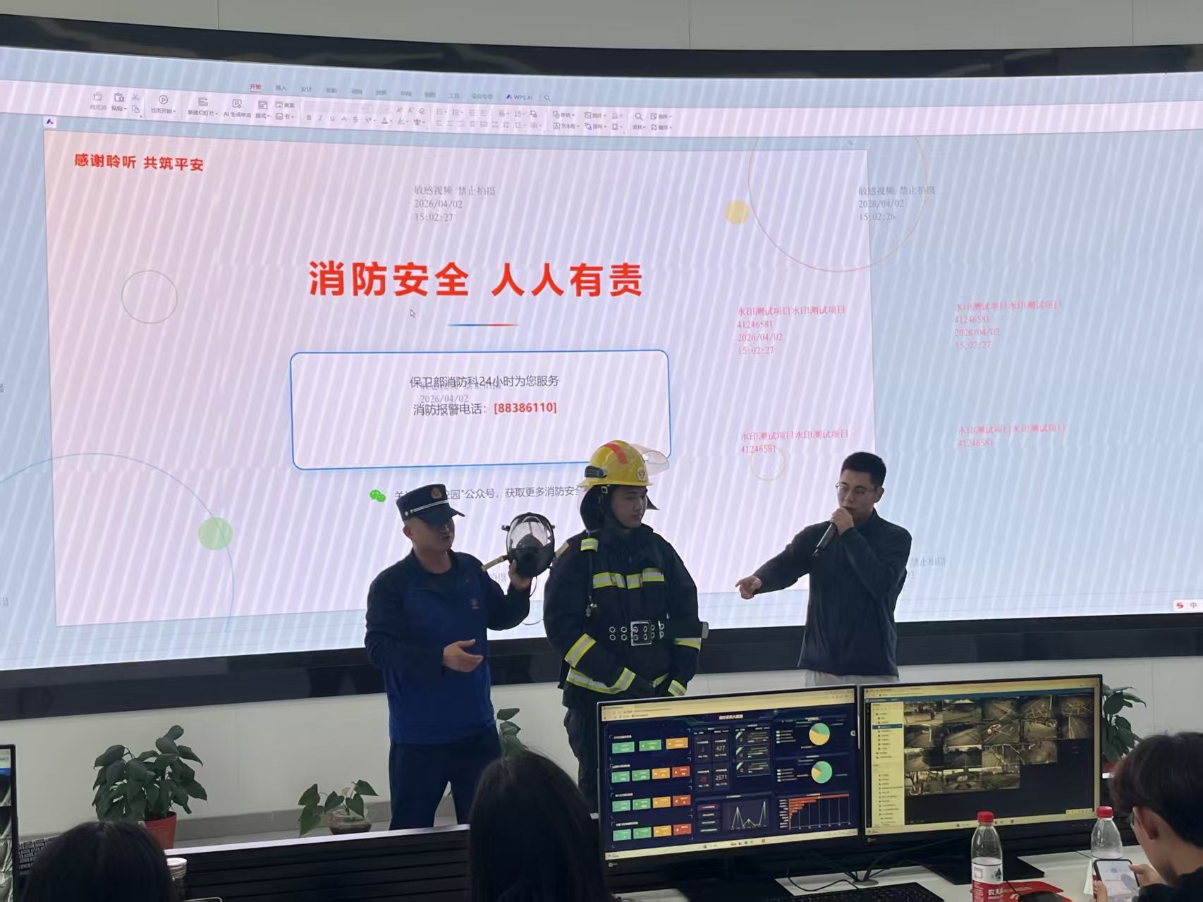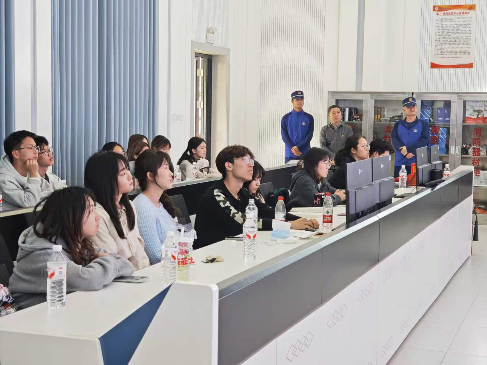 活动伊始,保卫部消防科讲解人员围绕科室核心职责,系统介绍了校园日常巡查、隐患排查、应急响应等全流程工作,帮助同学们构建起校园消防安全管理体系的完整认知。随后,重点讲解智慧消防物联网平台,通过大屏实时展示,让同学们直观了解物联网、大数据技术在消防工作中的应用。同时详细拆解平台工作流程,从感知端数据采集、后台分析研判到报警联动处置,实现火灾防控的智能化、精准化管理,层层递进,让大家深刻认识现代科技为校园消防带来的高效保障。