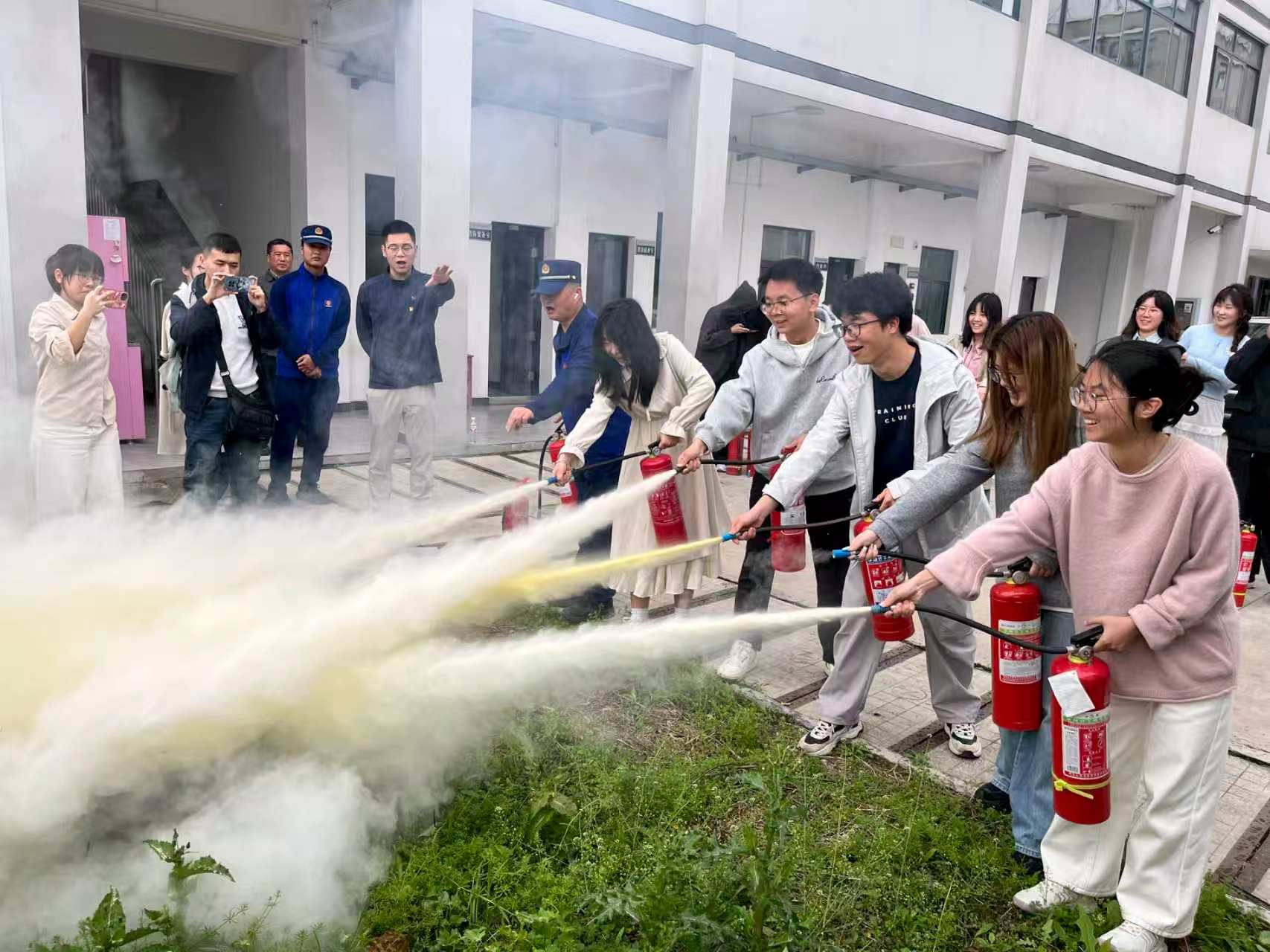 活动最后,组织开展了灭火器实操演练,在消防队员的专业指导下,大家严格遵循“提、拔、握、压” 四字要领,轮流手持灭火器对准火源根部喷射,沉着冷静完成灭火操作,切实掌握实用消防技能。